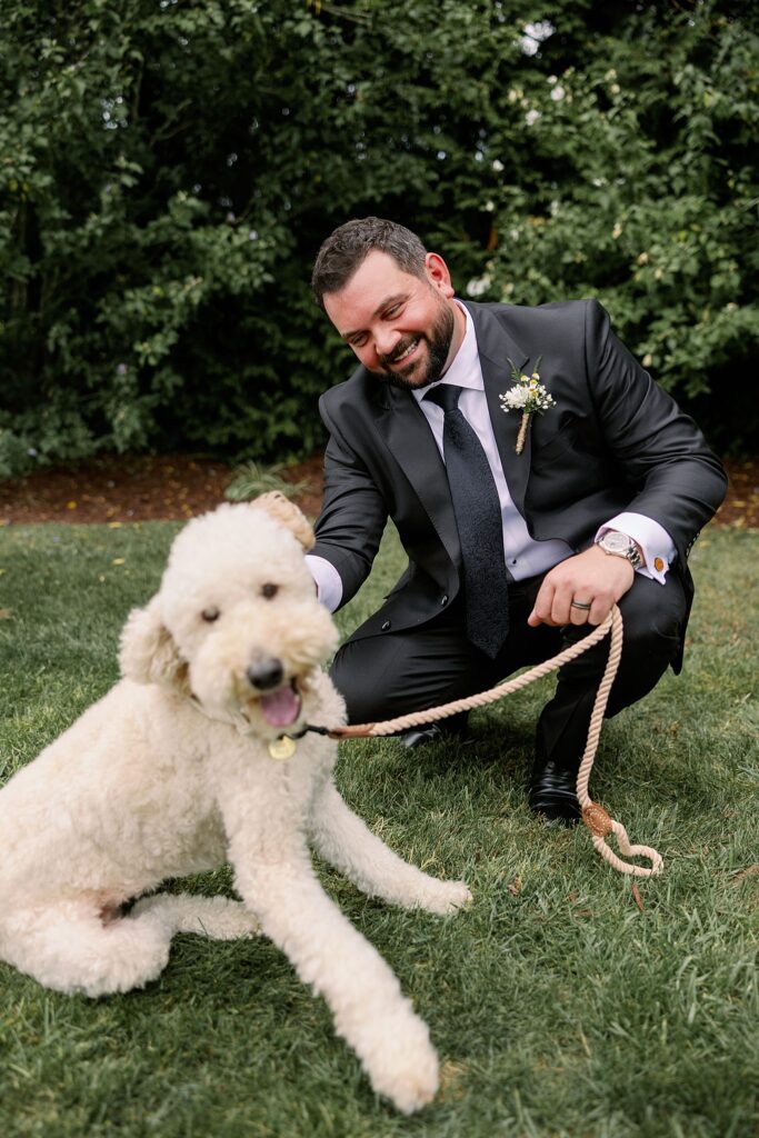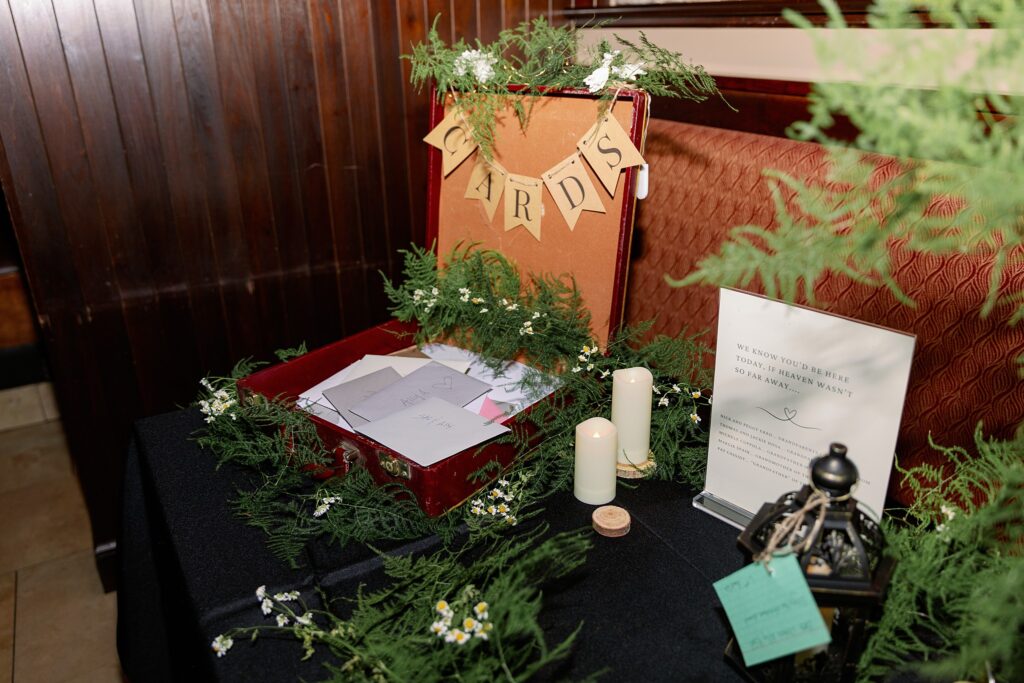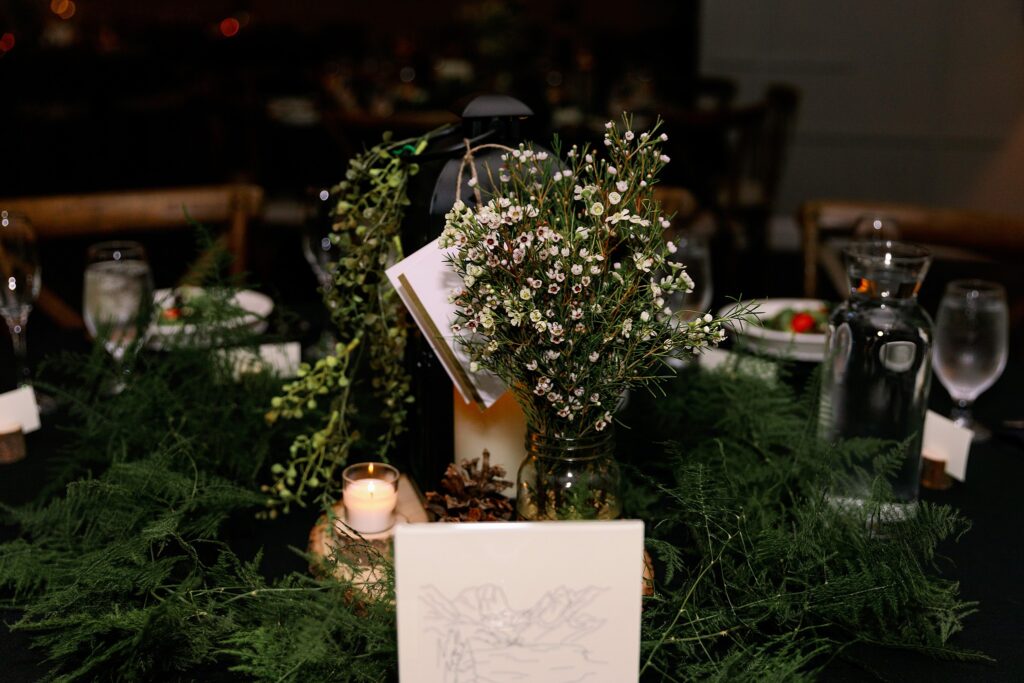 Inside, the décor was elegant and cozy, with floral arrangements by Flower Moxie and touches of Italian charm. Guests signed postcards instead of a traditional guestbook, each representing a place meaningful to the couple — such a creative touch! Among the decor was of course nodes to not only Ally and & Sal’s life together but also Millie, from the cocktail napkins to the cake pops!